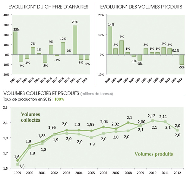 Pour la première fois en Europe, le taux du recyclage du verre a passé le cap des 70% en 2011. Plus de 11 millions de tonnes de verre, soit l'équivalent de plus de 25 milliards de bouteilles, ont été recyclées dans l'espace européen. La France figure parmi les bonnes élèves puisque 7 bouteilles sur dix sont recyclées sur le territoire français.Cependant, le volume de calcin produit en France par les unités de préparation afficherait un recul d'un peu plus de 5%. Cette baisse entraîne, par voie de conséquence, un recul de même proportion, du montant du chiffre d'affaires qui aurait atteint, en 2012, 160 millions d'€. Néanmoins, le calcin représente désormais 63% des matières de l'industrie de l'emballage en verre et certains fours, produisant du verre de couleurs, sont capables de produire à partir de plus de 90% de calcin.