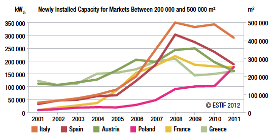 Cependant le marché européen est en régression depuis plusieurs années. En 2011, le marché du solaire thermique s'est élevé à 2,6 GW - portant la puissance du parc à 26,3 GW - soit une surface supplémentaire de capteurs de 3,66 millions de m2 contre 3,75 millions en 2010 et 4,17 millions de m2 en 2009.
